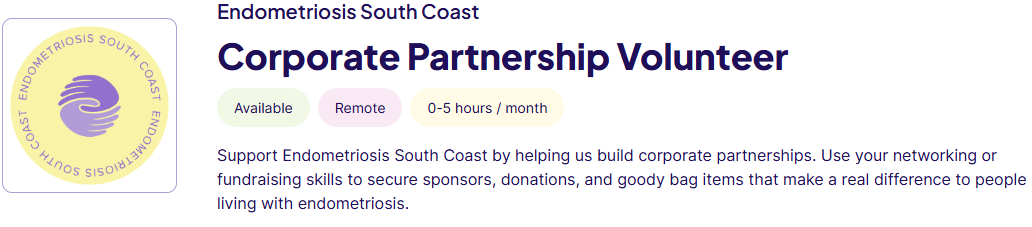 We are looking for volunteers to help us build and grow corporate partnerships that will support the work of Endometriosis South Coast. This is a flexible and rewarding opportunity for someone who enjoys building relationships, reaching out to businesses, and playing a part in a mission that directly improves the lives of those affected by endometriosis