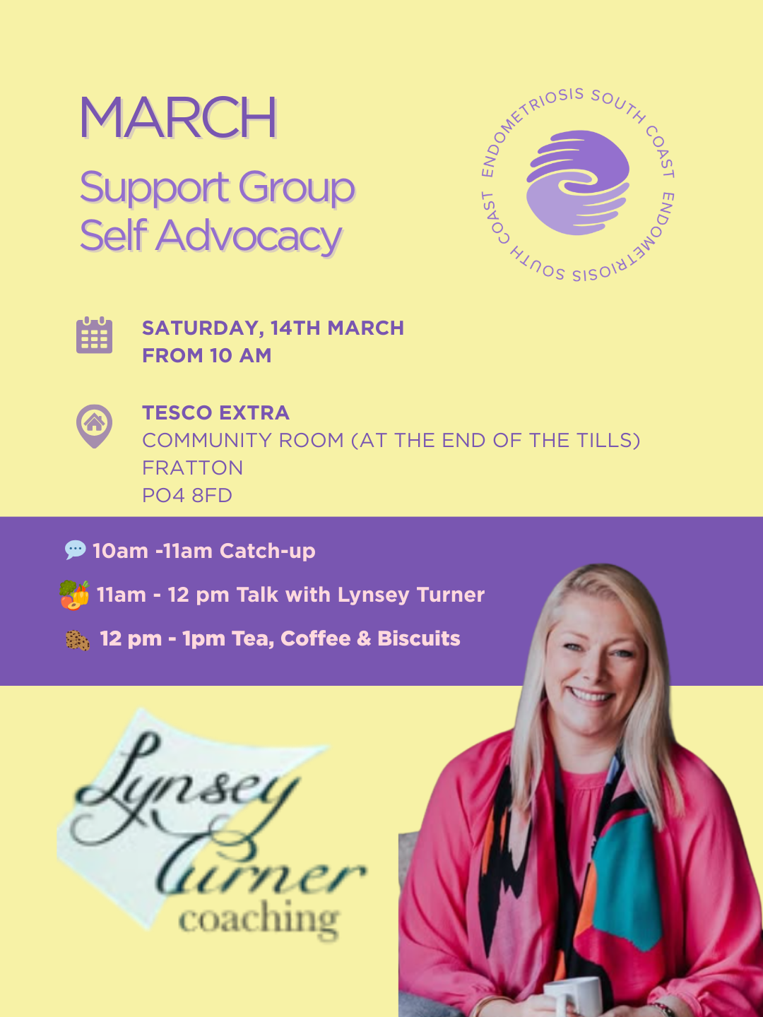 <p>Endometriosis support morning: peer chat, tea & guest talk with Lynsey Turner on Self Advocacy.</p>