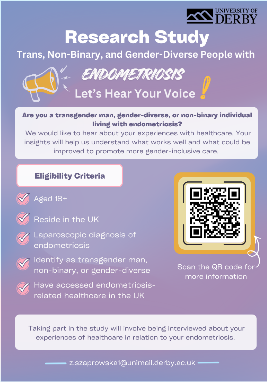 Zofia Szaprowska is a third-year psychology student at the University of Derby and is looking for participants to take part in her undergraduate research study, which aims to explore the lived experiences of endometriosis-related healthcare among transgender, gender –diverse, and non-binary (TGDNB) individuals with endometriosis living in the United Kingdom.